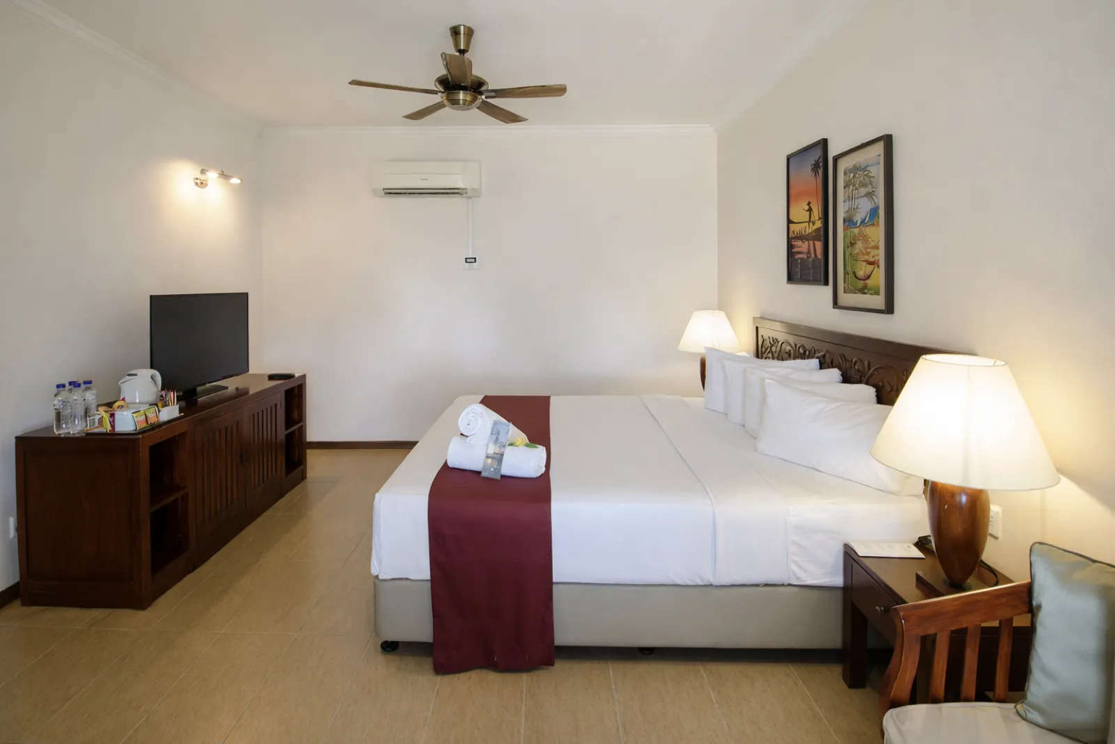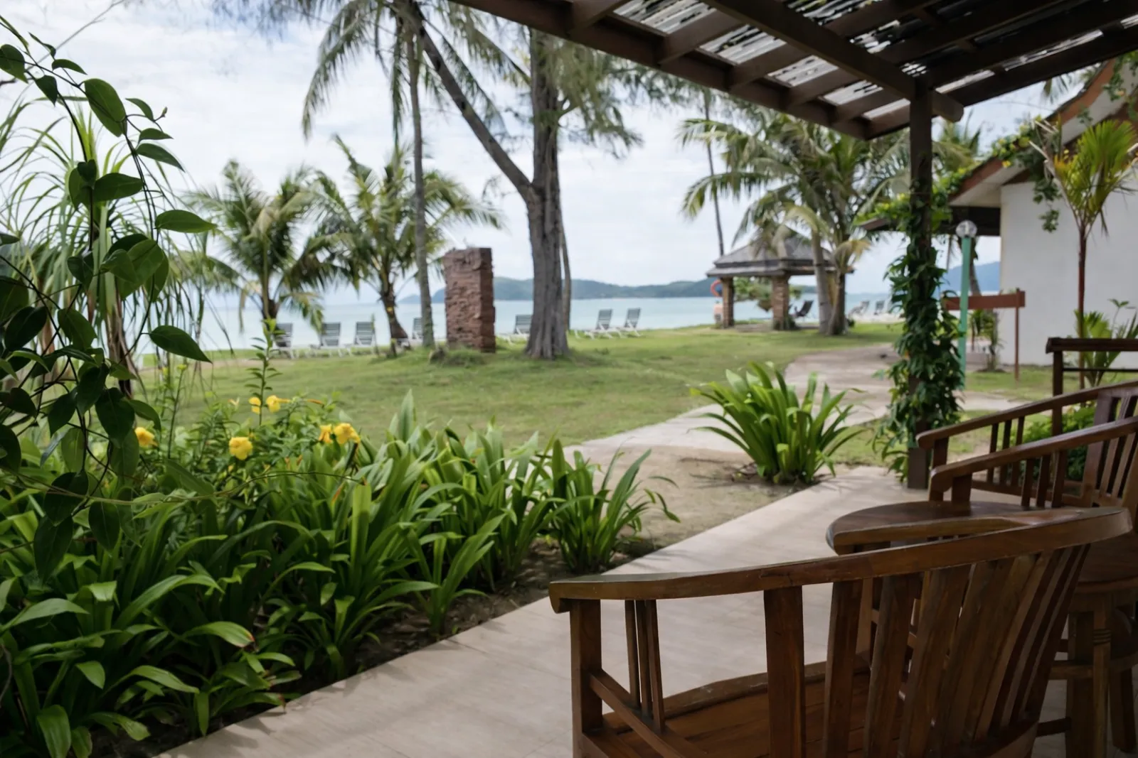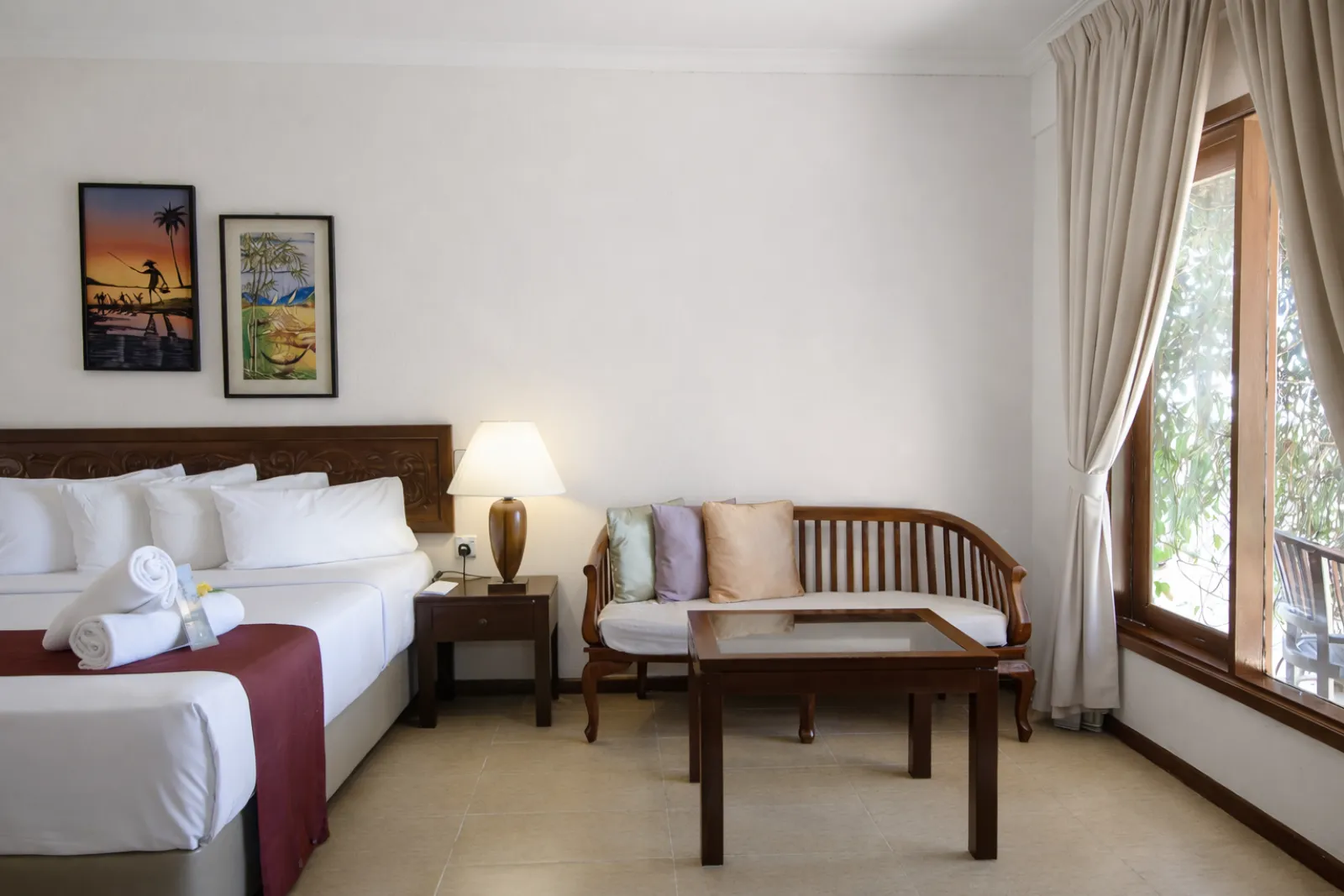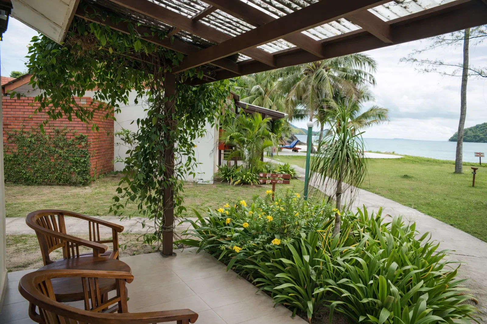 A comfortable King Bed rests at the centre of the room, accompanied by a cosy seating area where you can relax while watching the changing colours of the ocean. Outside, the shaded patio offers a quiet place to linger with the sea breeze drifting through. The semi-outdoor bathroom continues the connection to nature, where stone textures, greenery, and open sky create a refreshing space to unwind after a day by the beach.