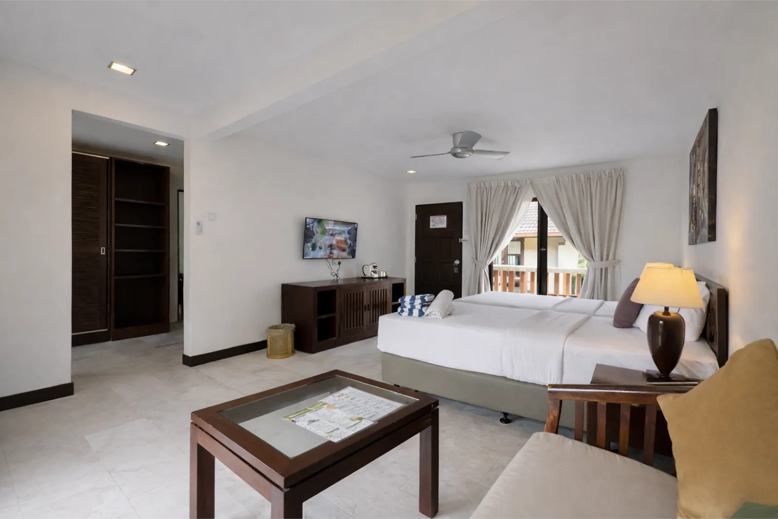 Thoughtfully designed for couples or friends travelling together, the Deluxe Room features a spacious layout with either a king bed or twin beds at its centre. Soft natural tones, wooden furnishings, and gentle lighting create a welcoming atmosphere where guests can unwind after a day spent exploring Langkawi.