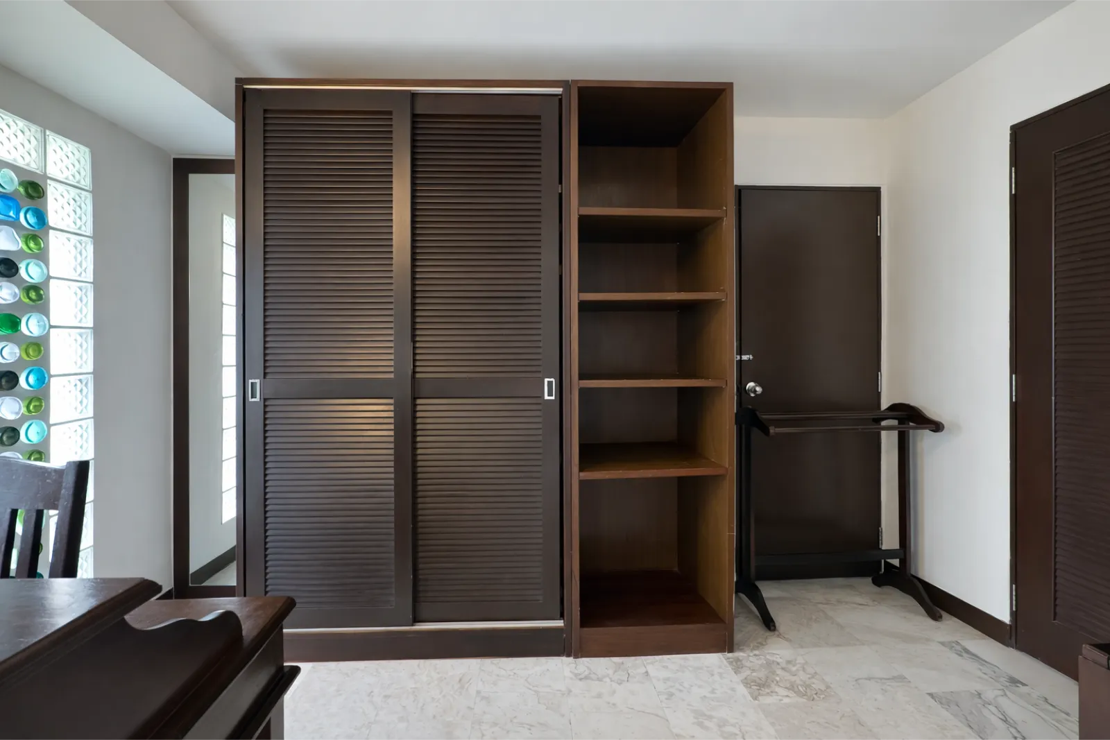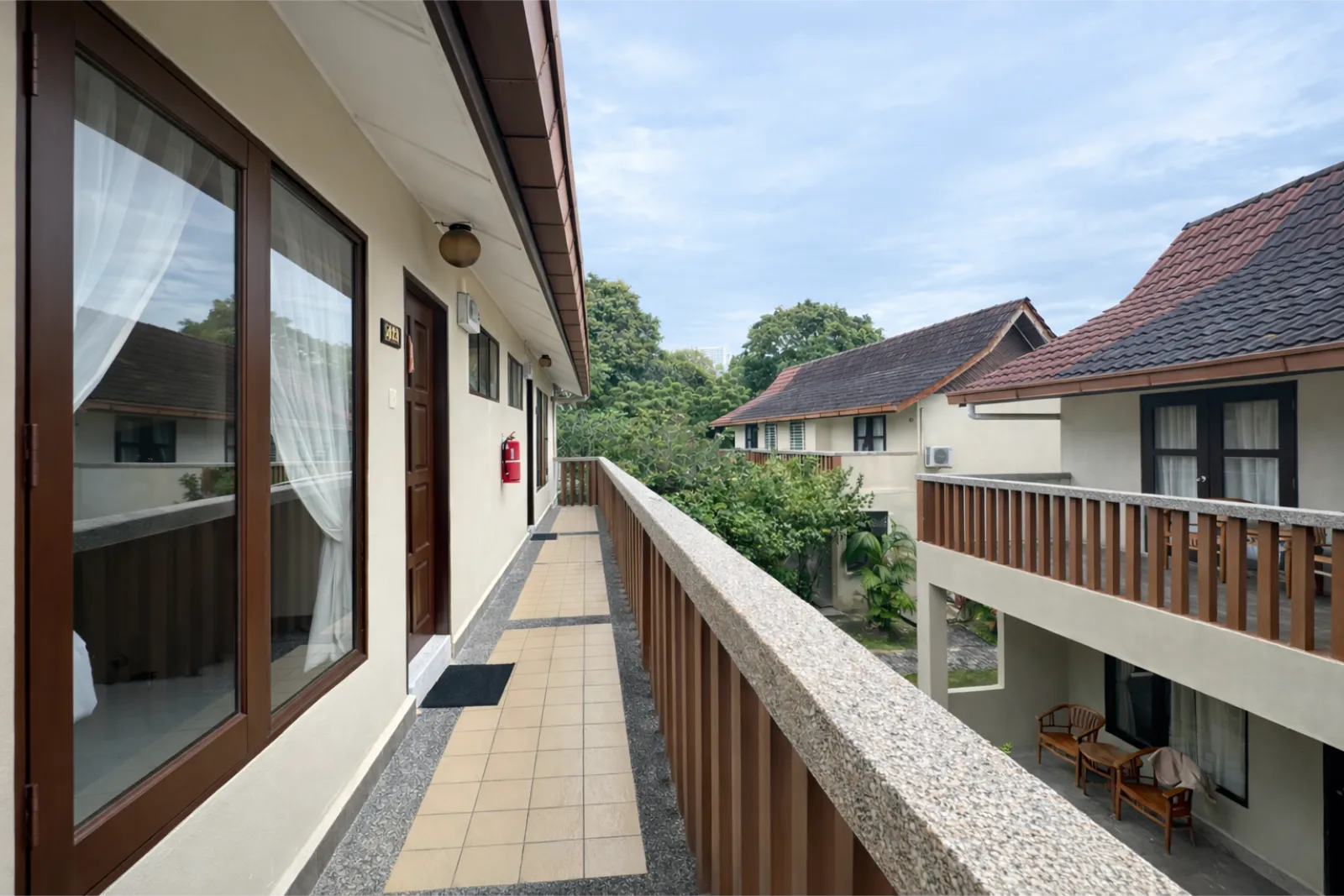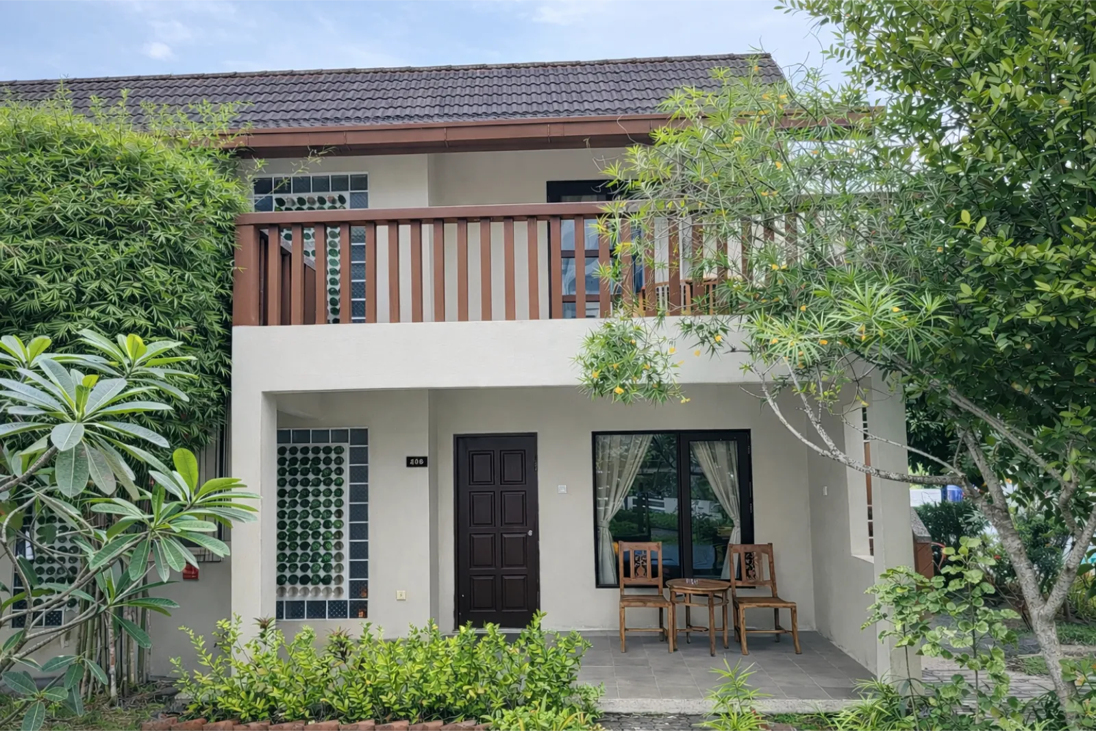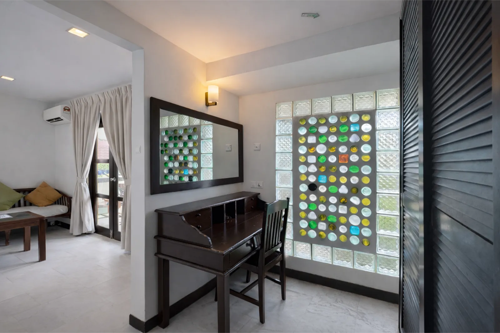 A cosy seating area beside large windows invites quiet moments of rest, while the surrounding garden views bring a sense of calm into the room. Just outside, a balcony or terrace offers a peaceful spot to enjoy fresh air and the tropical surroundings, making it easy to settle into the slow pace of island living.